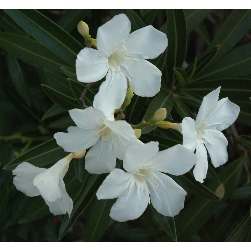 Oleander (Nerium oleander), is a evergreen shrub or small tree in the dogbane family Apocynaceae. It is the only species currently classified in the genus Nerium. Other names include Adelfa, Alheli Extranjero, Baladre, Espirradeira, Flor de São Jose, Laurel de jardín, Laurel rosa, Laurier rose, Flourier rose, Olean, Aiwa, Rosa Francesca, Rosa Laurel, and Rose-bay (Inchem 2005); in Chinese it is known as 夹竹桃 (jia zhu tao). The ancient city of Volubilis in North Africa took its name from the old Latin name for the flower.